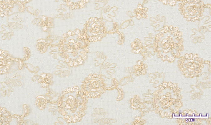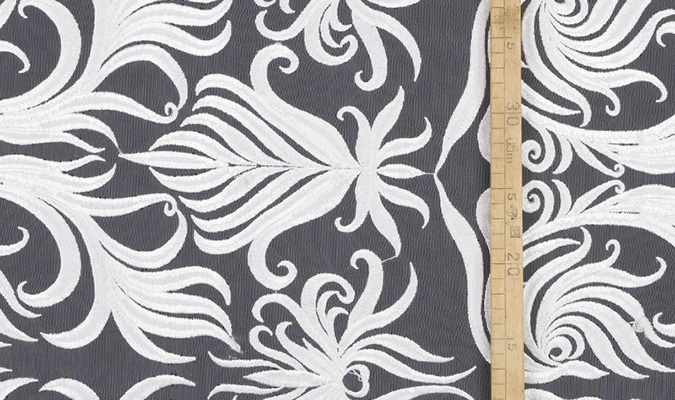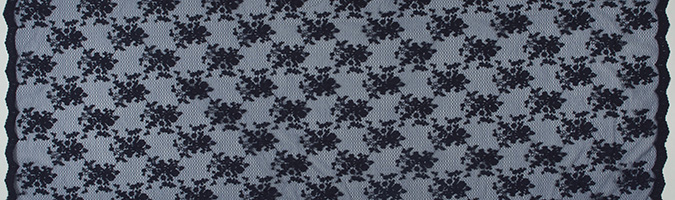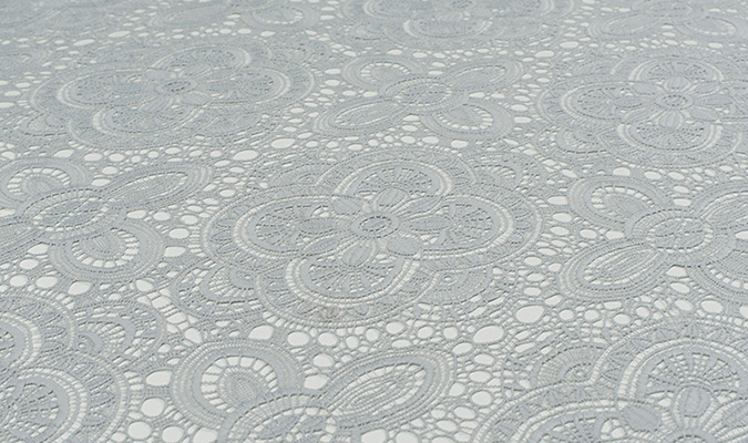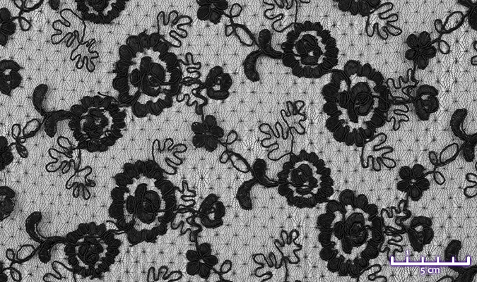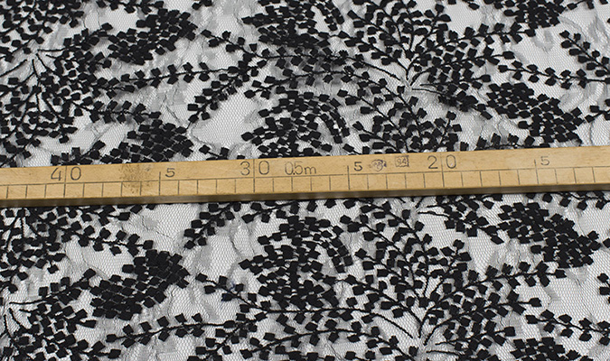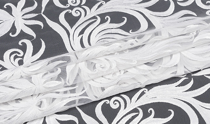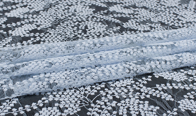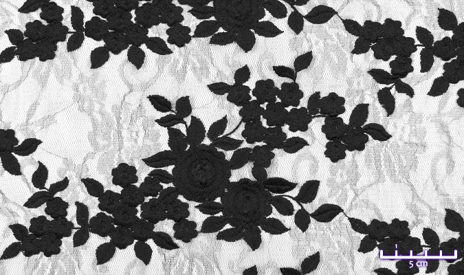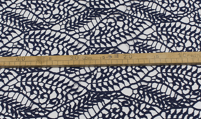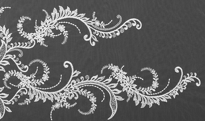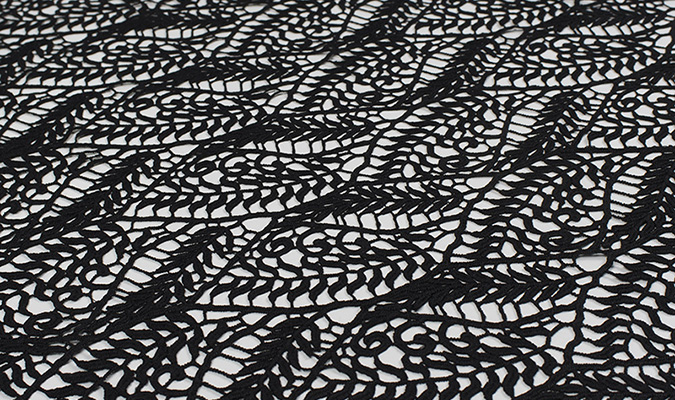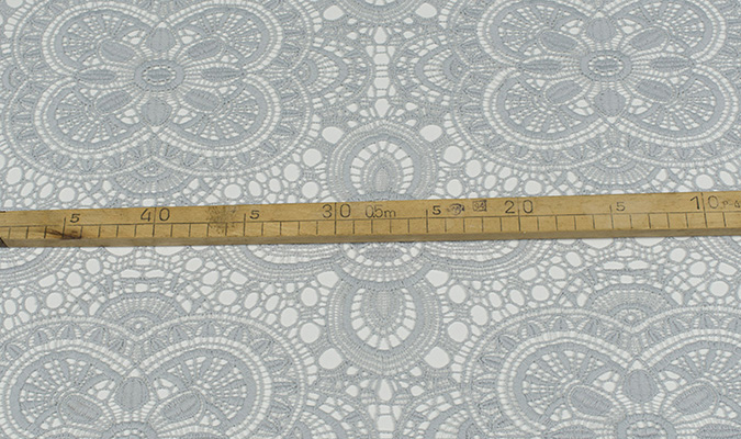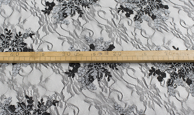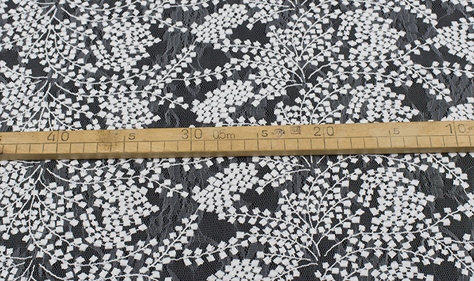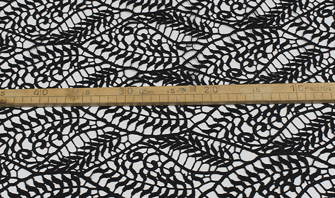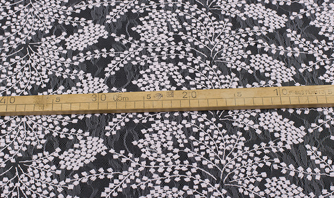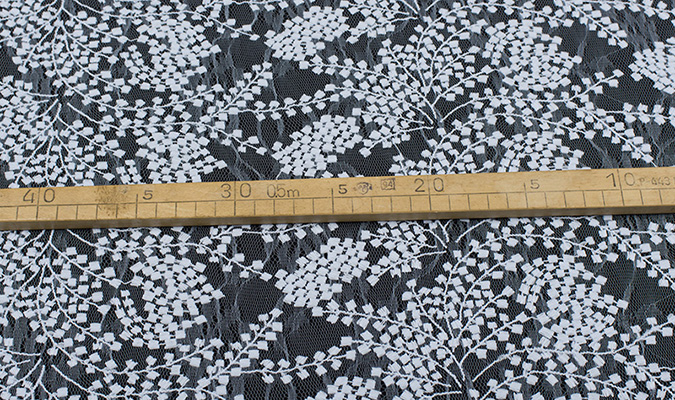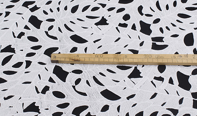 Gipiura Materiał stabilny (nieelastyczny) z gęstym wzorem na tiulu. Tkanina posiada wykończone brzegi.