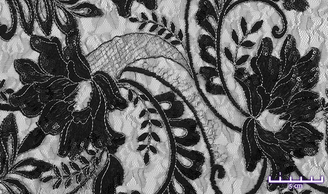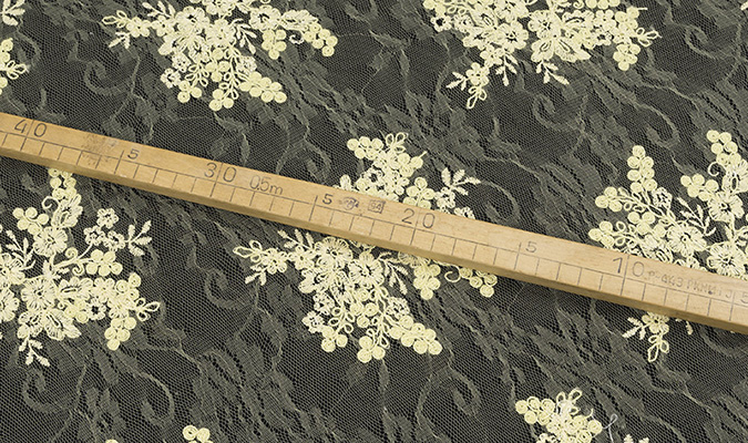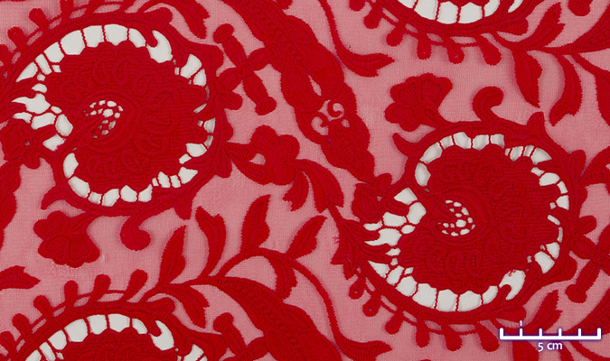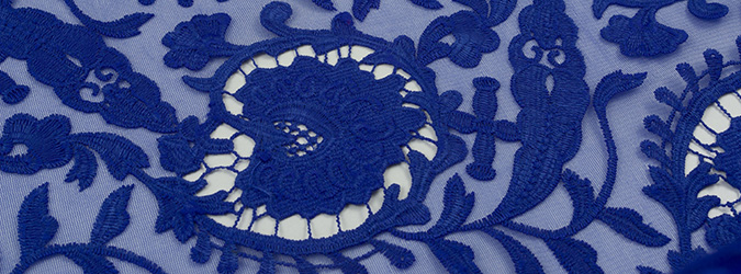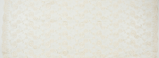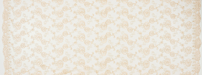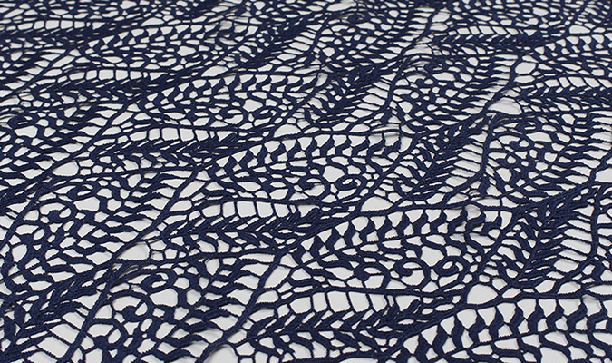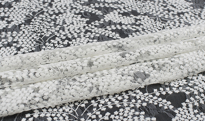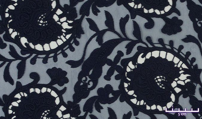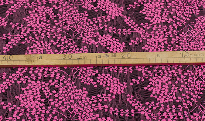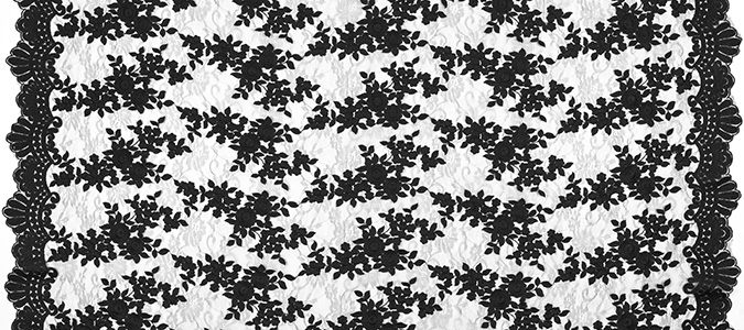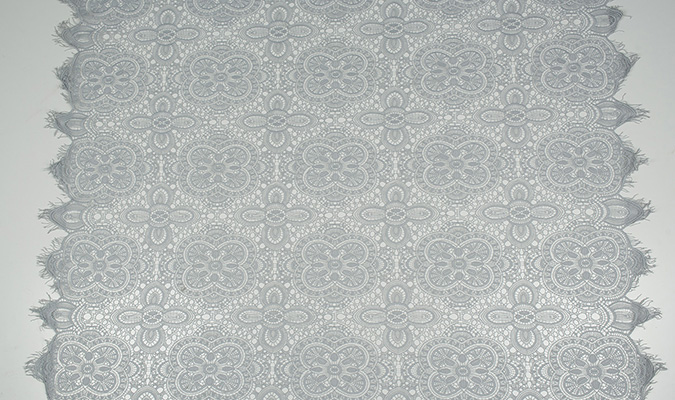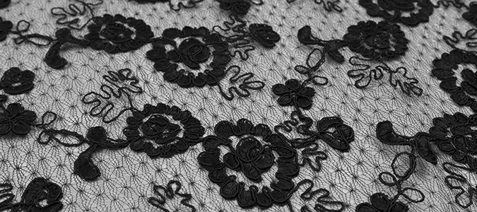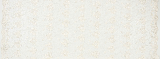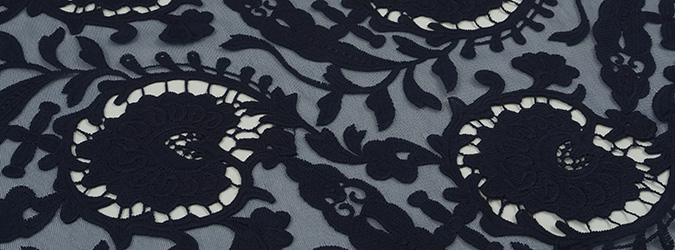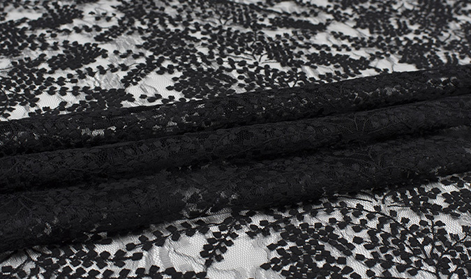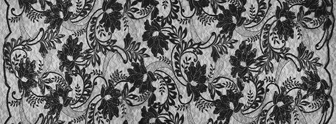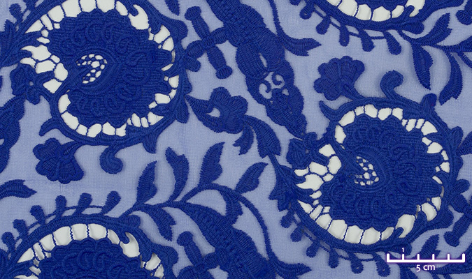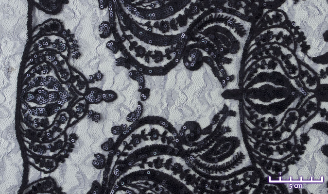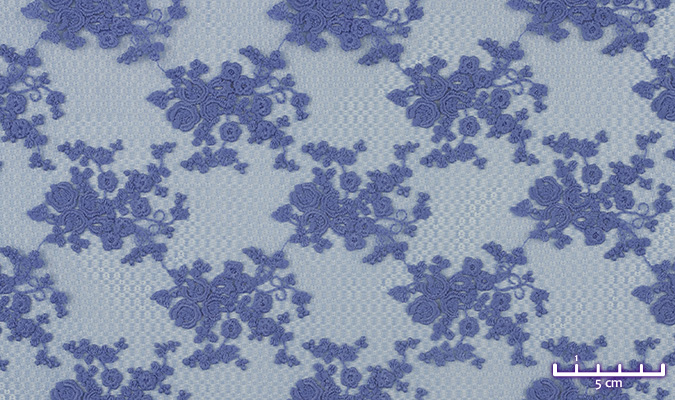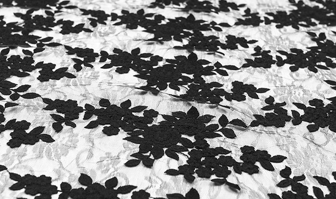 Gipiura Materiał stabilny (nieelastyczny) z gęstym wzorem na tiulu. Tkanina posiada wykończone brzegi.