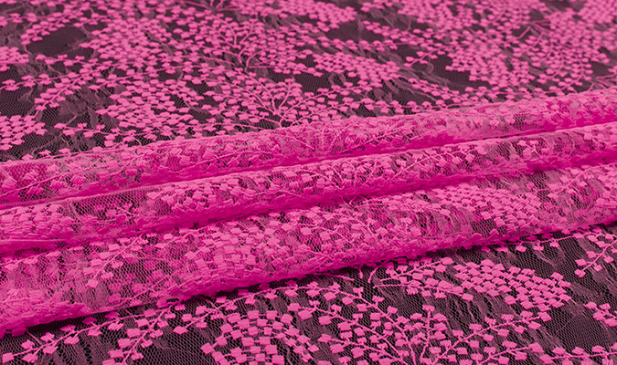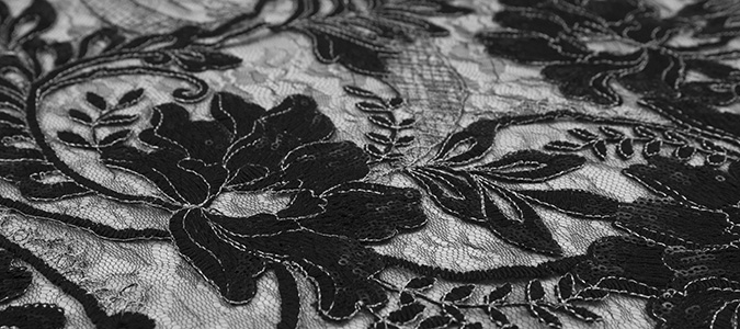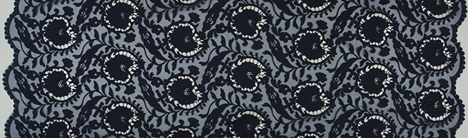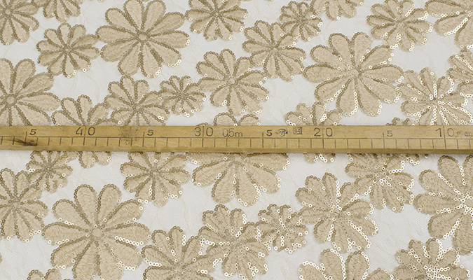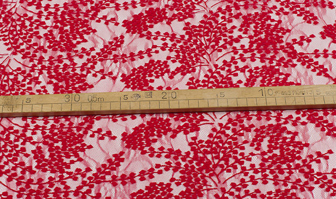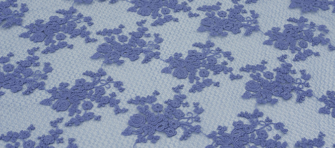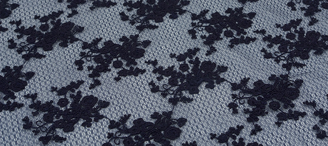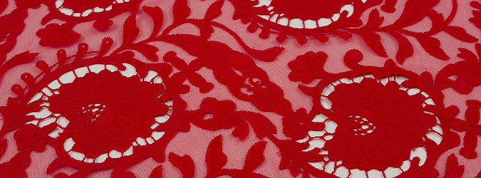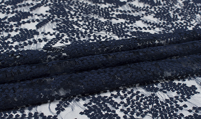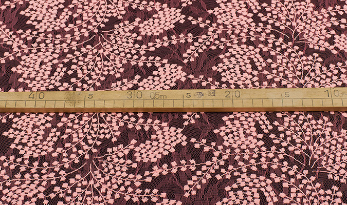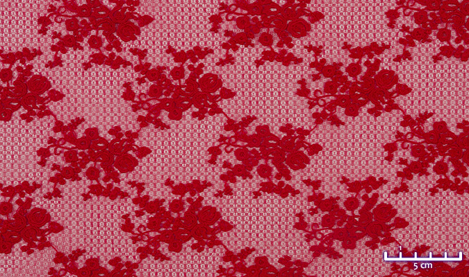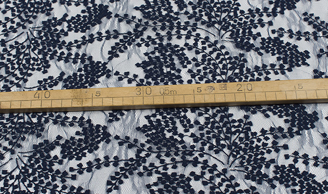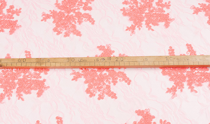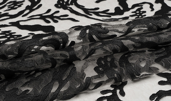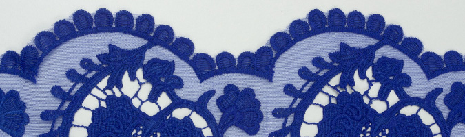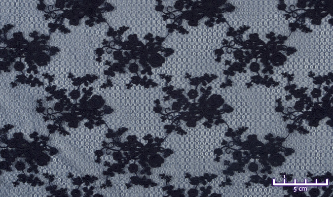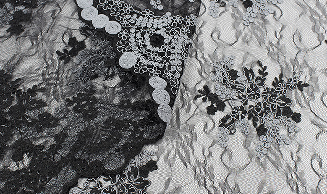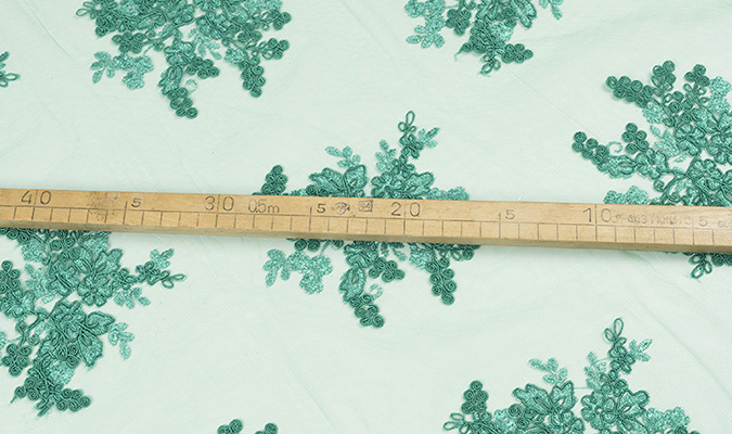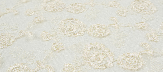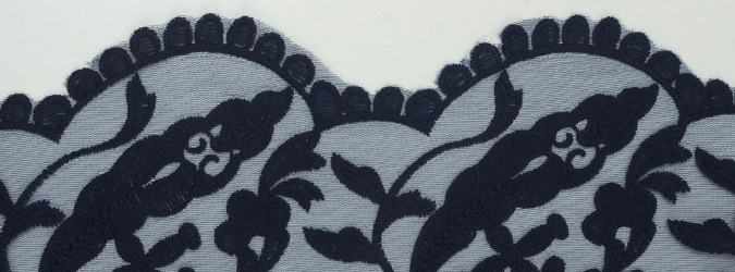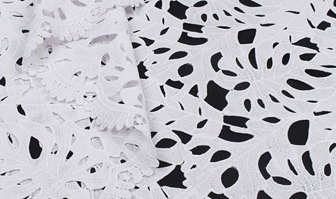 Gipiura Materiał stabilny (nieelastyczny) z gęstym wzorem na tiulu. Tkanina posiada wykończone brzegi.