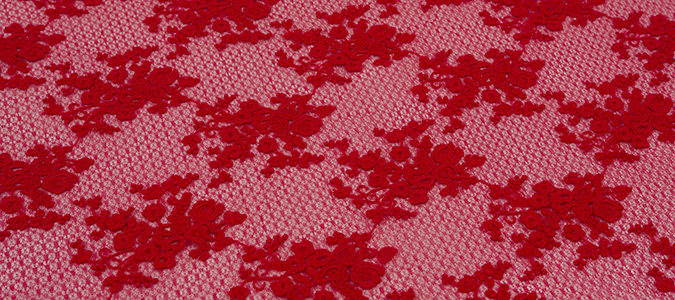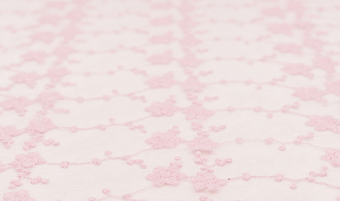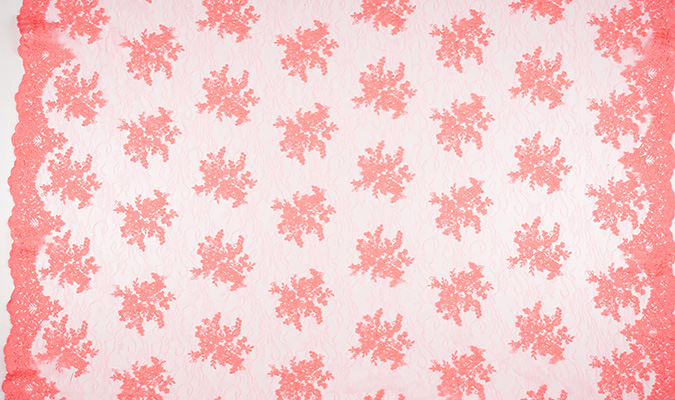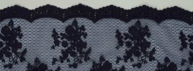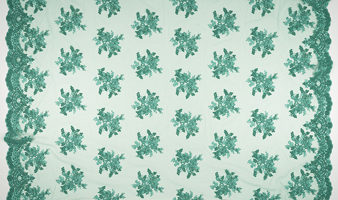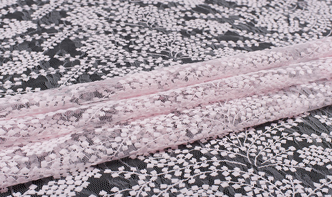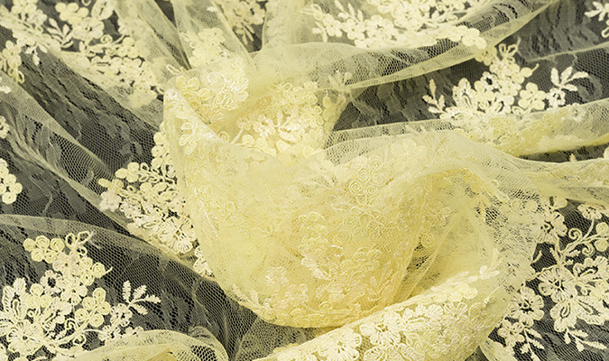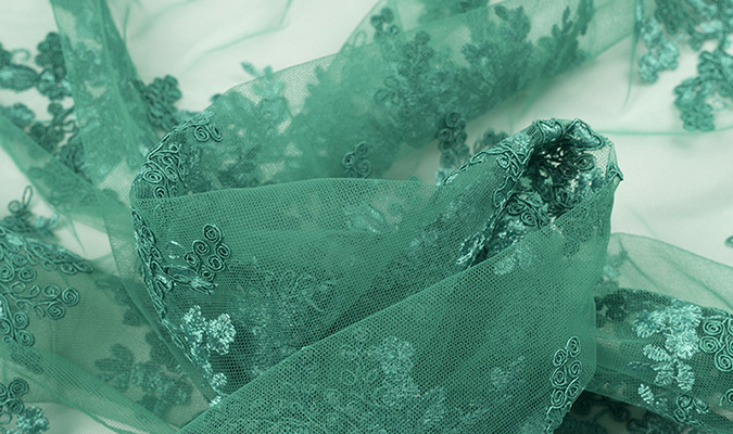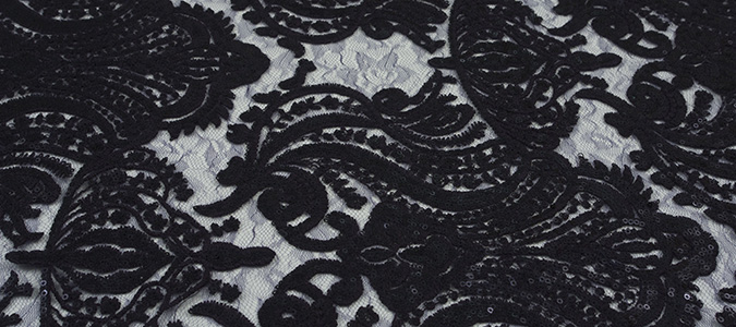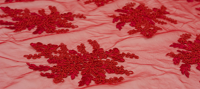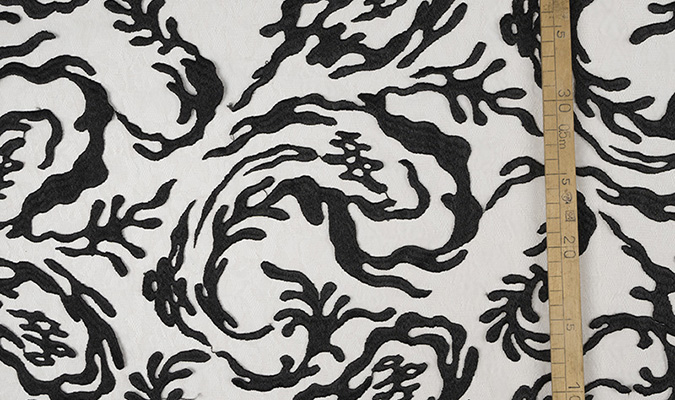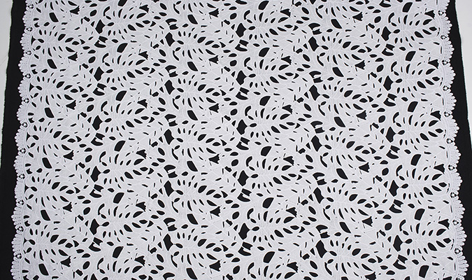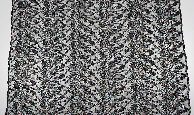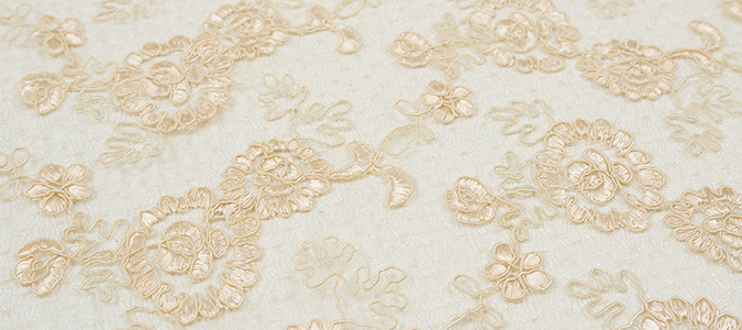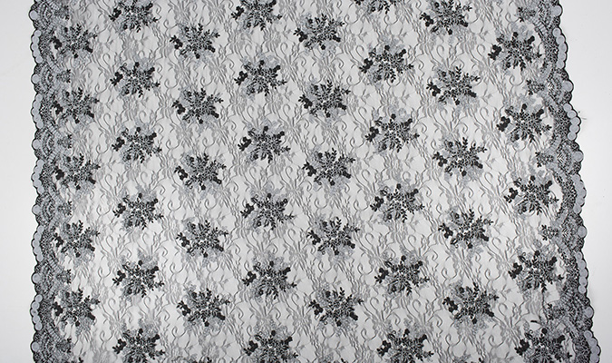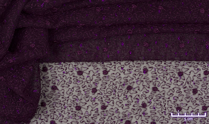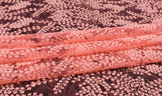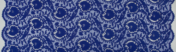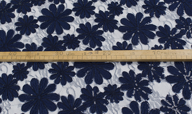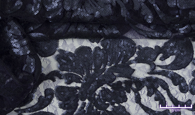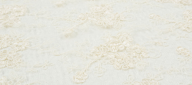 Gipiura Materiał stabilny (nieelastyczny) z gęstym wzorem na tiulu. Tkanina posiada wykończone brzegi.