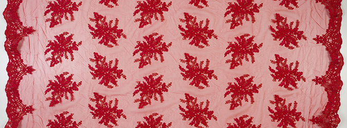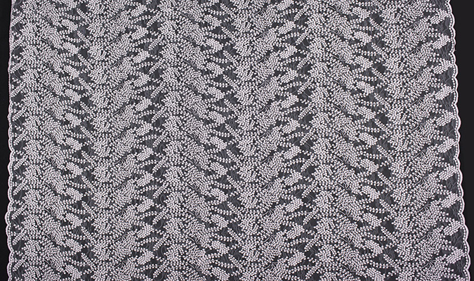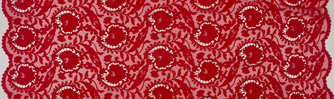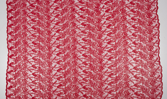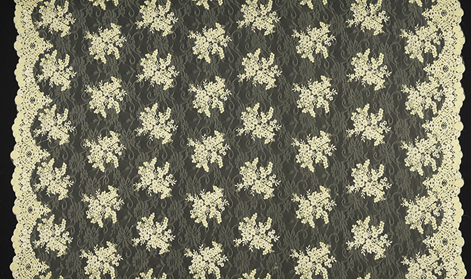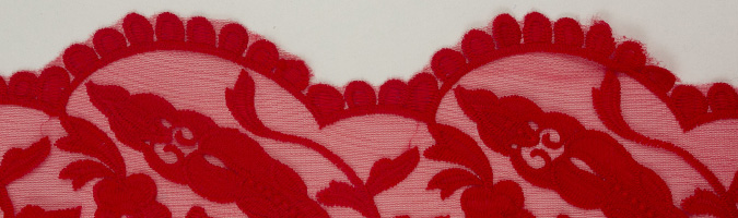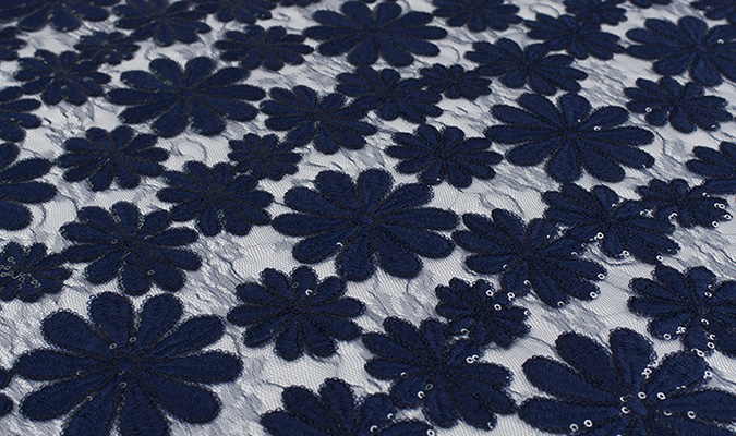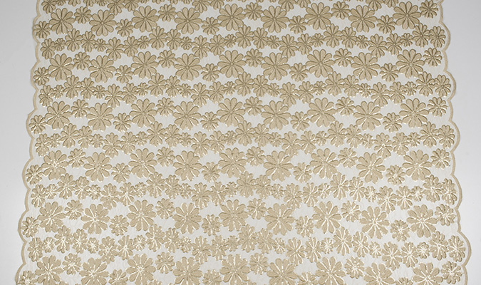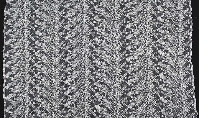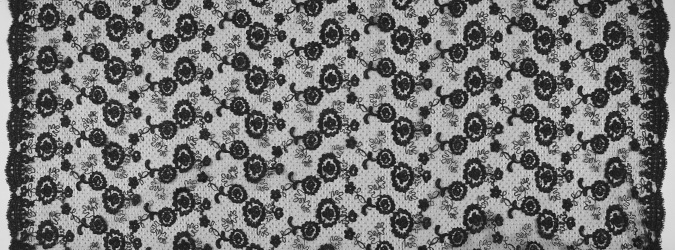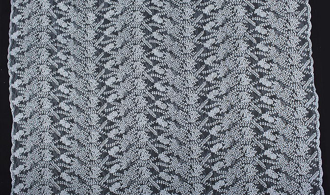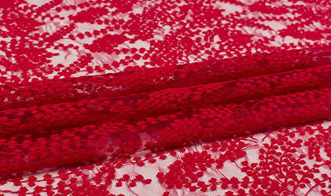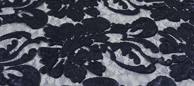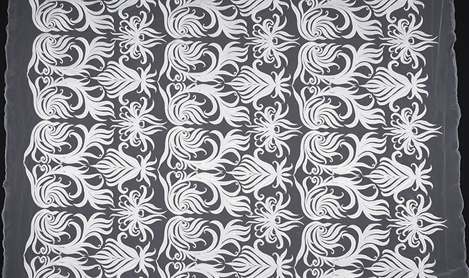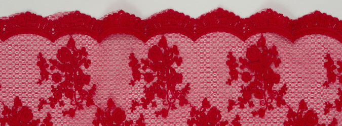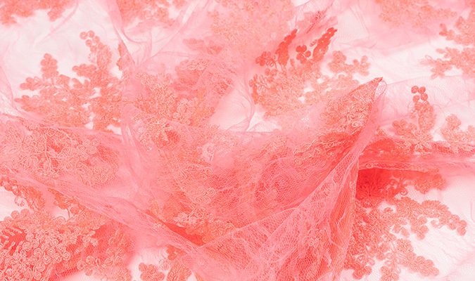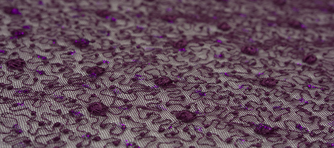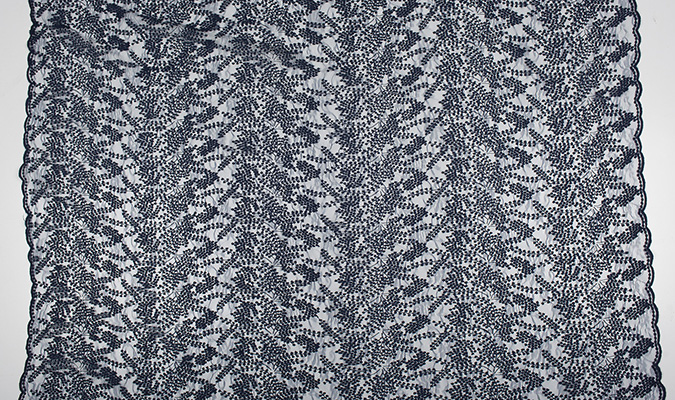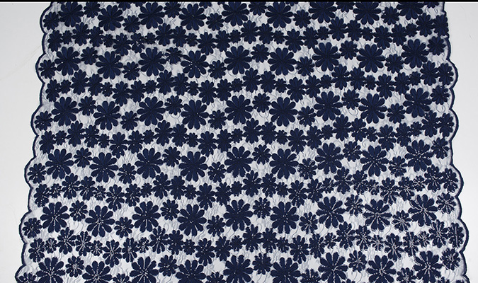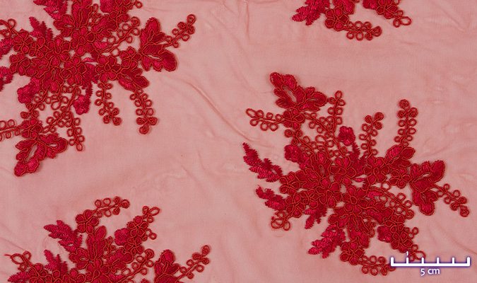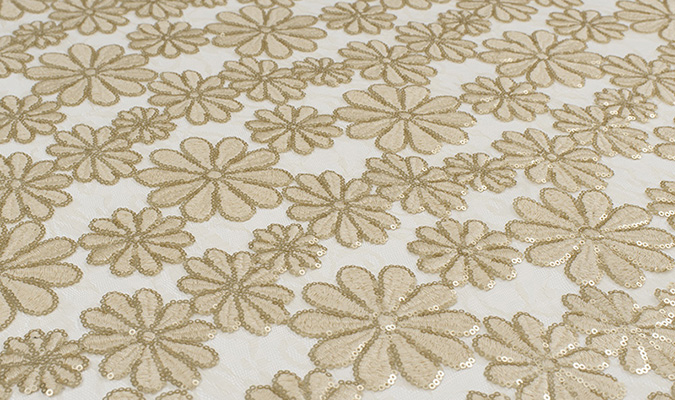 Gipiura Materiał stabilny (nieelastyczny) z gęstym wzorem na tiulu. Tkanina posiada wykończone brzegi.